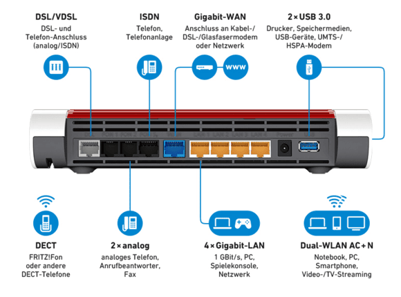 Avm Fritz Box 7490 International 4 Port Gigabit Wi Fi 11ac Router With Integrated Fttc Adsl Modem
