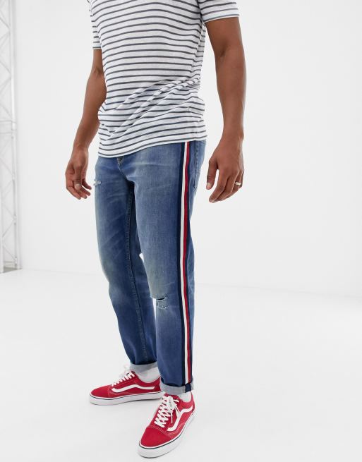Asos Design Schmal Zulaufende Jeans In Verwaschenem Mittelblau Mit Roten Seitenstreifen