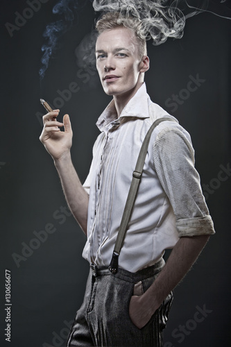 Junger Blonder Mann In 20er Jahre Kleidung Raucht Zigarre