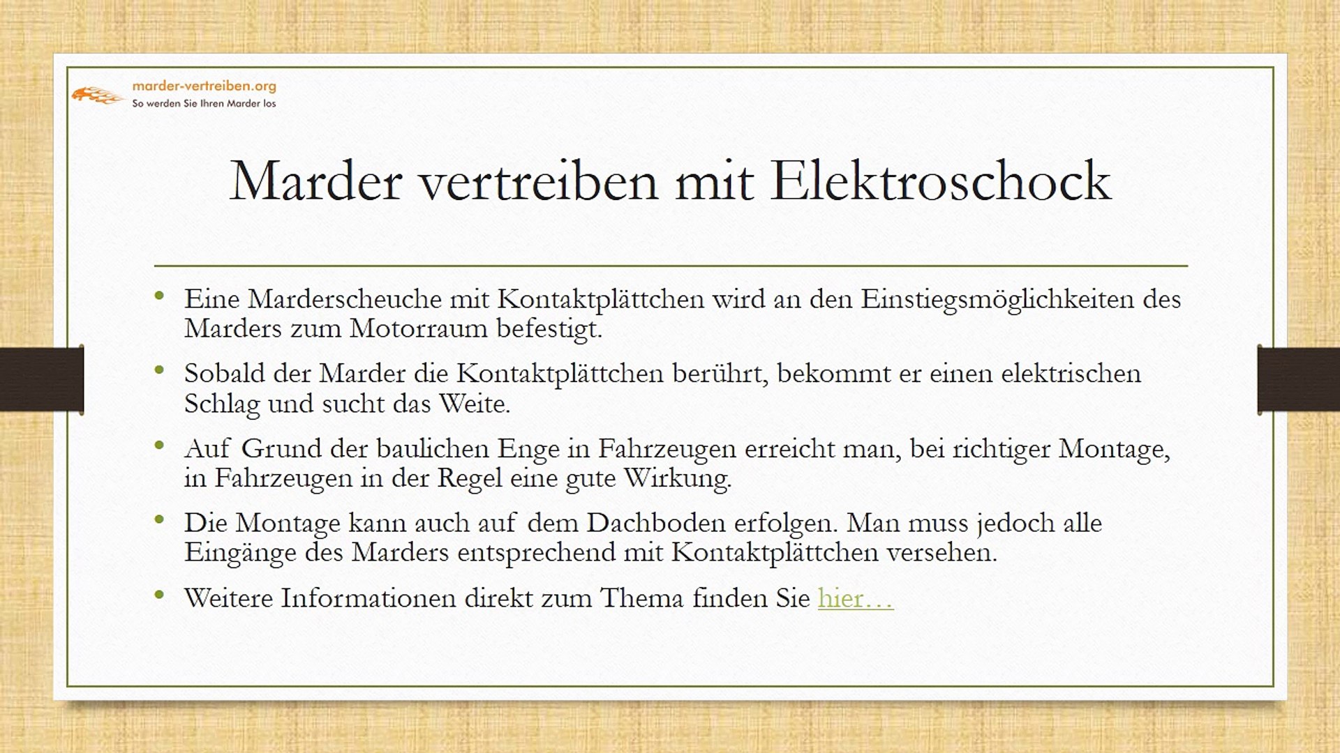 Diese marderabwehr marder vertreiben mittel wirken alle mit ultraschall und vertreiben dieses beutetier vom dachbodendiese ultraschall anlagen eignen sich aber auch zur abwehr von waschbaren. Sie sollten auch schlupflocher und ritzen abdichten durch die der marder auf den dachboden gelangt. Da der marder nicht standig da ist bleibt die anwesenheit des steinmarders haufig lange unbemerkt. Wenn sie ihr haus und ihren dachboden marderunfreundlich gestalten dann wird er diesen ort in zukunft meiden.